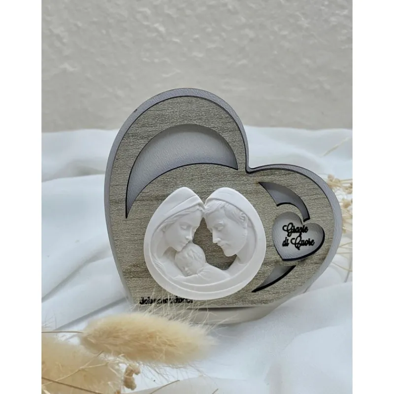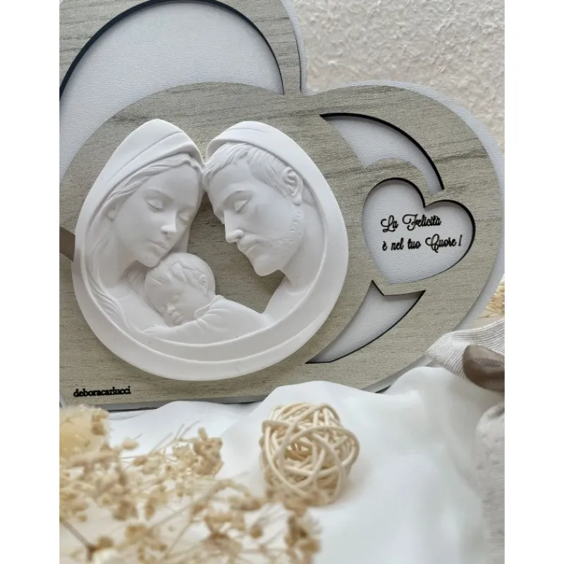 Icona Sacra Famiglia, in resina bianca, applicata su un cuore in legno