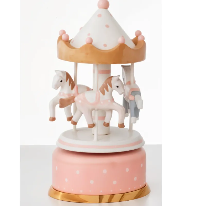 Delizia i tuoi ospiti con la Giostra Carillon “Rosa” di Encantada, alta 17 cm. Questo affascinante carillon in legno, dipinto a mano, raffigura cavalli che danzano al suono di una melodia dolce, rievocando l’incanto delle giostre d’epoca.
