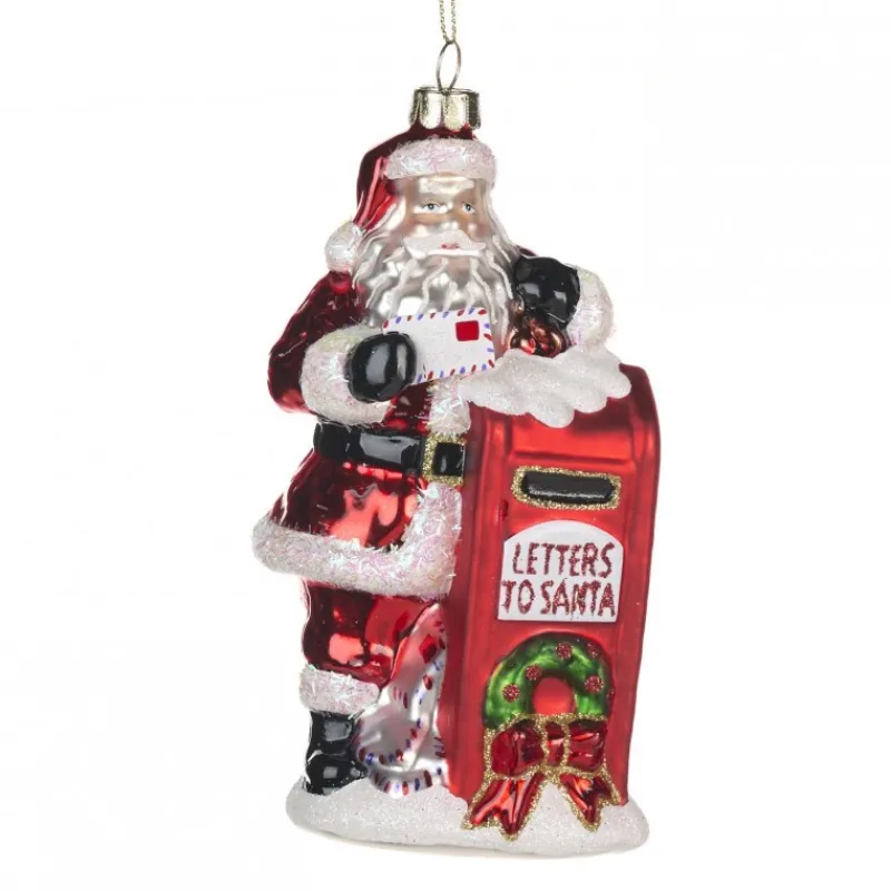 Santa Claus con cassetta delle lettere di 15 cm, realizzato in vetro. Questo ornamento natalizio, con una finitura brillante e dettagli vivaci, è perfetto per aggiungere un tocco di magia e comunicazione alle tue decorazioni festive. Ideale per chi ama i dettagli nostalgici e festivi.