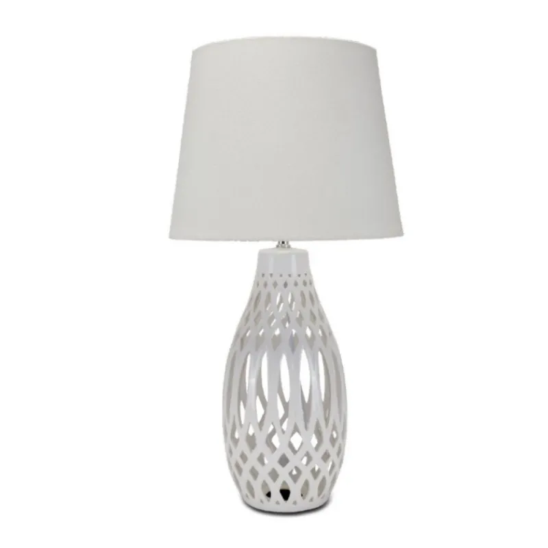Lampada in Ceramica con Paralume in Tessuto Corpo Bianco, Paralume Nero Altezza 70cm Diametro 34cm
