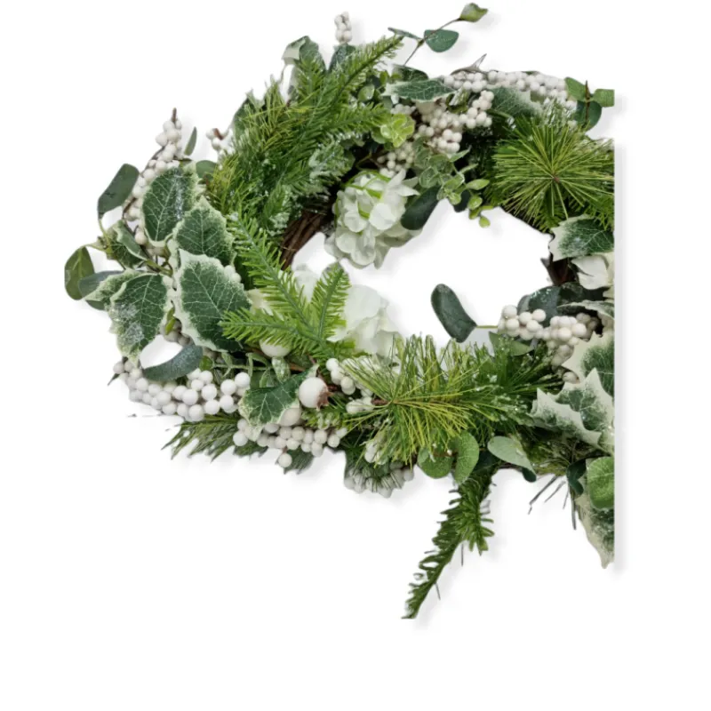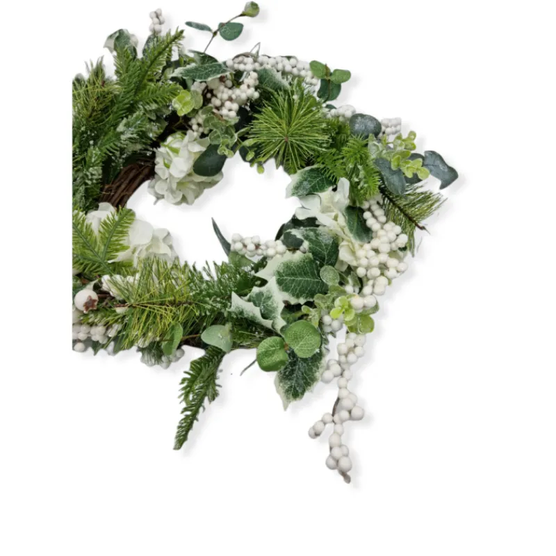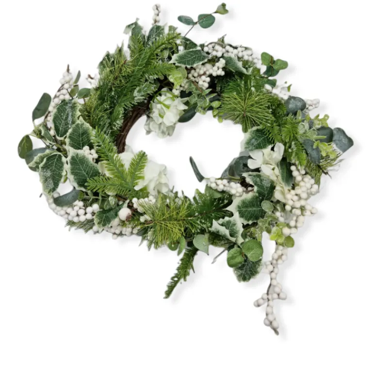 GHIRLANDA DI PINO FOGLIE EUCALYPTO BACCHE E FIORI AVORIO 80%PLAS 20%MET Diametro: più di 35cm aperta